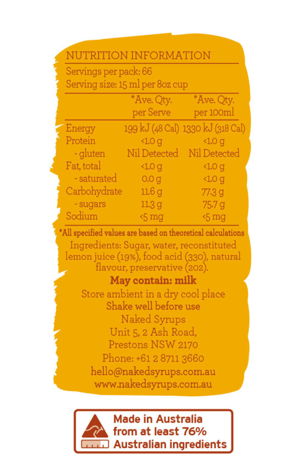 Naked Syrups Traditional Lemonade is made using locally grown and squeezed Australian lemon pulp which allows the zest & sweetness to be present as a traditional lemonade should. The Traditional Lemonade can be used as a soda, Cocktail/Mocktail or even in an iced tea. A great Lemon Flavoured Flavouring.